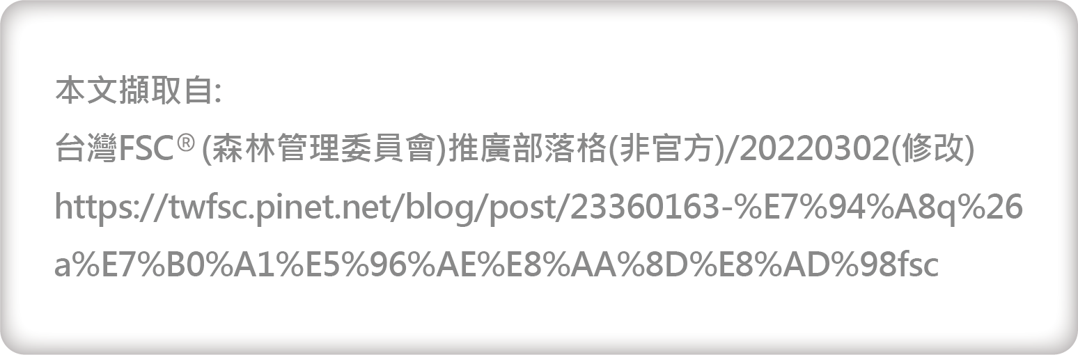 Forest Stewardship Council® (森林管理委員會),簡單來說,它是一個獨立、非政府、非營利組織,成立的目的是推廣永續經營世界的森林。FSC的木業產品(含紙張)則為對“森林友善”的產品。例如IKEA,B&Q,Home Depot,都陸續使用 FSC木材。又如匯豐銀行(HSBC),全錄(Xerox)等使用者,都選擇使用的 FSC紙品。