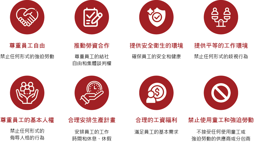 本公司及全體員工體認到,遵守國際勞工標準和維護勞工權益是一個負責任之公司所具備的基本條件,也是消費者、客戶、公眾和政府等利益相關者的期望。本公司承諾遵守國家勞動法律法規、遵守國際公認的勞工標準、以及其他適用的行業標準和國際公約,持續改善工作條件和員工福利,與品質管制一樣,社會責任管理也是本公司日常動作的一個有機組成部分,履行社會責任是公司提供良好產品滿足客戶需要的一個必要條件。特以此文告知所有與本公司配合之合作伙伴並請各位合作伙伴一同遵守及執行。